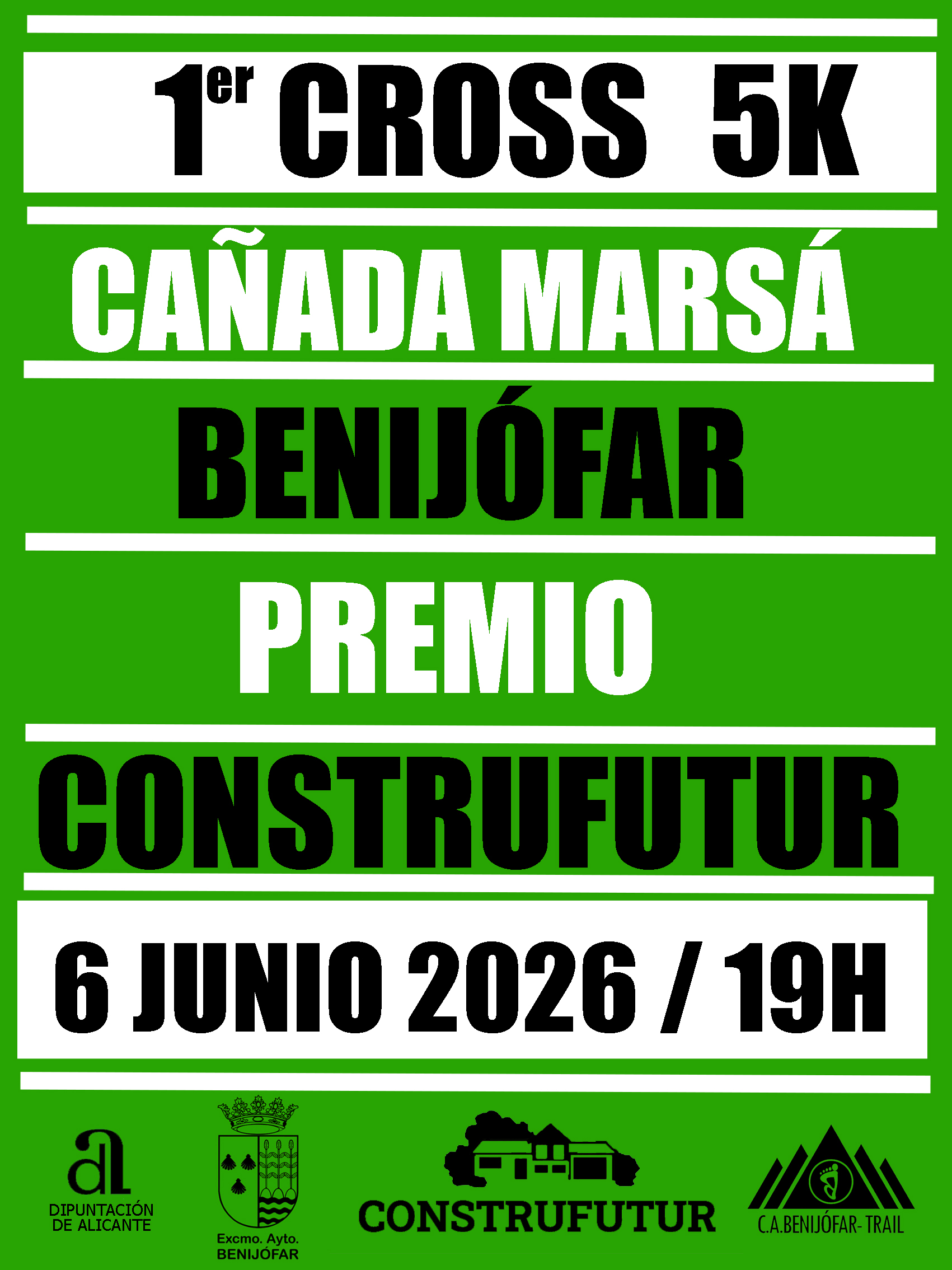 – El C.A Benijófar, con la colaboración del Ayuntamiento de Benijófar, organiza el “1er Cross Cañada Marsá Benijófar 5km Premio Construfutur, que se celebrará en la localidad de Benijófar (Vega Baja) Alicante, el Sábado, 6 de Junio de 2026, a las 19:00h.